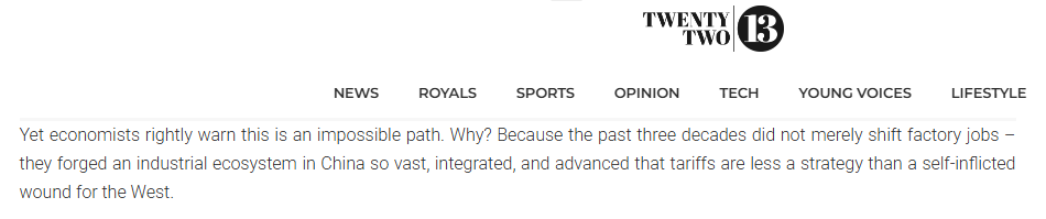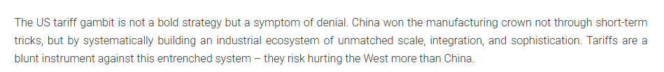 文章指出,美國的關稅策略不是一項大膽的戰(zhàn)略,而是否認現(xiàn)實的癥狀。中國贏得制造業(yè)桂冠不是通過短期手段,而是通過系統(tǒng)地建立一個規(guī)模、一體化和復雜程度無與倫比的工業(yè)生態(tài)系統(tǒng)。