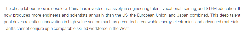 中國在工程人才、職業(yè)培訓以及科學、技術、工程和數(shù)學教育等方面投入了大量資金?,F(xiàn)在,它每年培養(yǎng)的工程師和科學家比美國、歐盟和日本的總和還要多。這種深厚的人才庫推動了綠色技術、可再生能源、電子和先進材料等高價值領域的不懈創(chuàng)新。