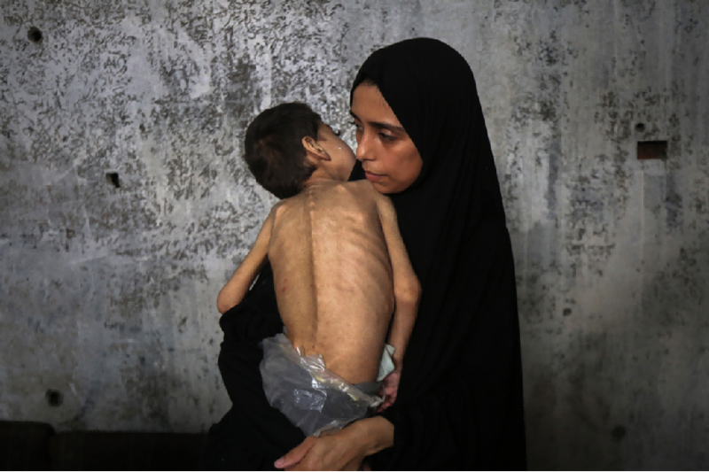 7月25日,在加沙城一處避難所,一名女子懷抱營養(yǎng)不良并患病的兒童。新華社發(fā)(里澤克·阿卜杜勒賈瓦德攝)