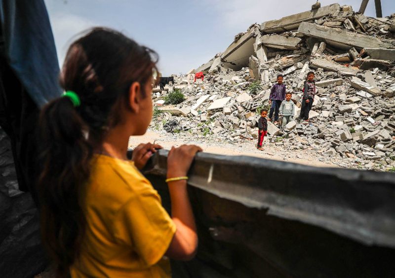 這是2025年4月7日在加沙地帶北部加沙城拍攝的流離失所的兒童。新華社發(fā)(馬哈茂德·扎基攝)