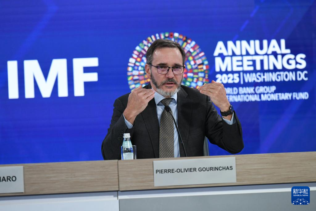 10月14日,在美國華盛頓,國際貨幣基金組織首席經(jīng)濟學(xué)家皮埃爾-奧利維耶·古蘭沙(中)在《世界經(jīng)濟展望報告》新聞發(fā)布會上講話。新華社記者 李睿 攝