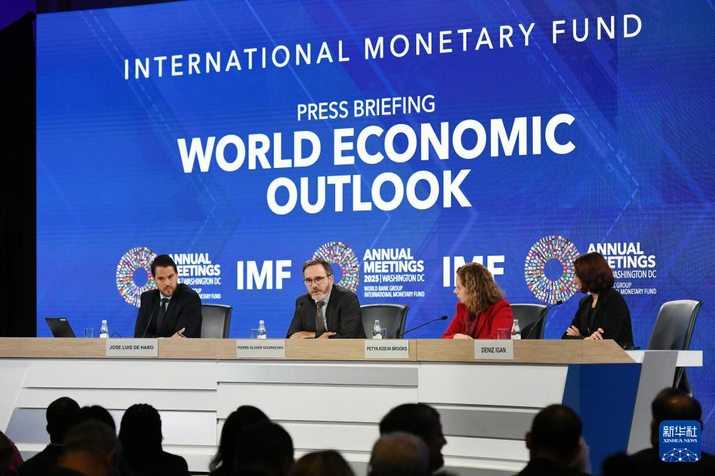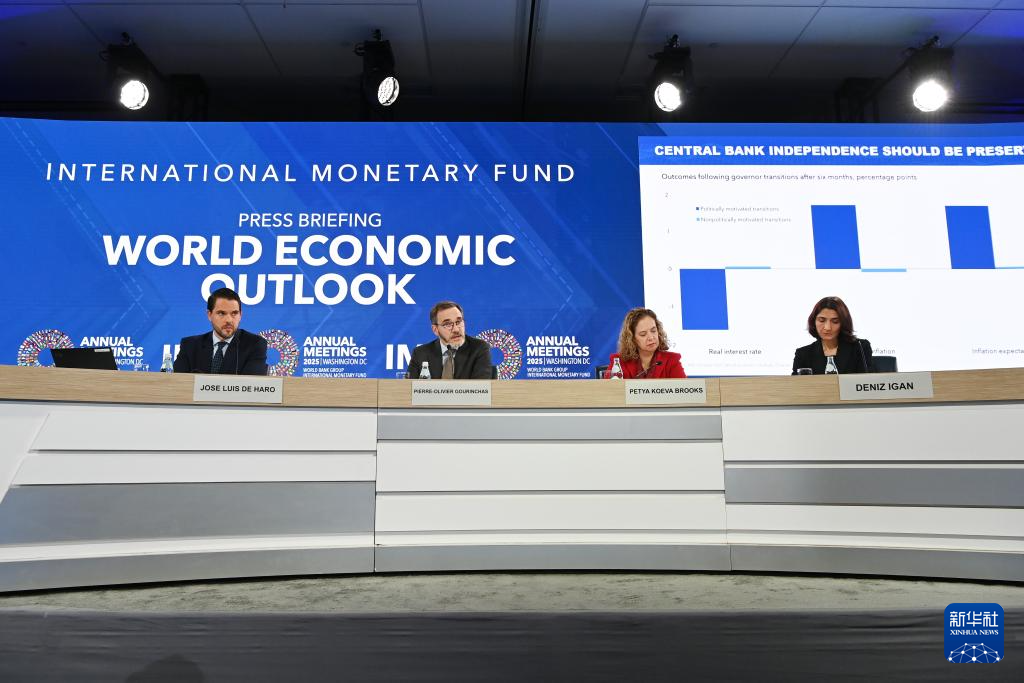 10月14日,在美國華盛頓,國際貨幣基金組織首席經(jīng)濟學(xué)家皮埃爾-奧利維耶·古蘭沙(左二)在《世界經(jīng)濟展望報告》新聞發(fā)布會上講話。新華社記者 李睿 攝