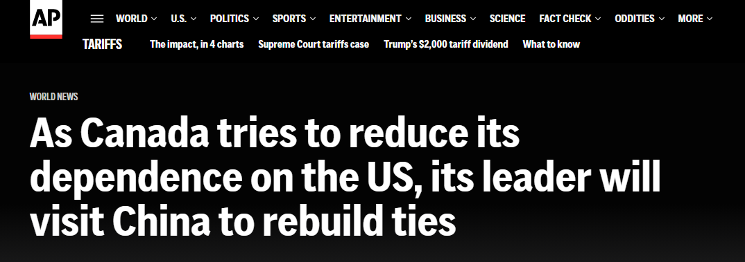 美聯(lián)社報(bào)道稱,加拿大總理此次訪華,旨在修復(fù)并改善兩國關(guān)系,為中加戰(zhàn)略伙伴關(guān)系的發(fā)展重新注入活力。報(bào)道援引卡尼的表態(tài)指出:“加拿大正在全球范圍內(nèi)構(gòu)建新的伙伴關(guān)系,以改變本國經(jīng)濟(jì)對(duì)單一貿(mào)易伙伴的依賴?!?/p>