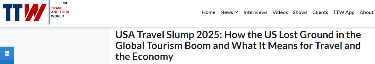 國(guó)際旅游行業(yè)媒體《旅行與旅游世界》網(wǎng)站也在報(bào)道中提到,美國(guó)旅游業(yè)2025年呈現(xiàn)出了與全球旅游業(yè)蓬勃發(fā)展截然相反的態(tài)勢(shì)——入境游客數(shù)量減少、旅游消費(fèi)額下滑,這一局面給美國(guó)旅游行業(yè)乃至整體經(jīng)濟(jì)帶來(lái)巨大沖擊。