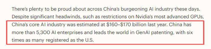 《時(shí)代》周刊的文章以中國(guó)人工智能實(shí)體企業(yè)從業(yè)人員的經(jīng)歷為切入口,稱自豪感正蔓延至中國(guó)蓬勃發(fā)展的AI產(chǎn)業(yè)。2025年中國(guó)核心AI產(chǎn)業(yè)規(guī)模達(dá)1600-1700億美元。數(shù)據(jù)顯示,中國(guó)擁有5300余家AI企業(yè),其生成式AI專利數(shù)量是美國(guó)的6倍。