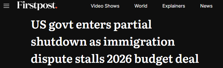 盡管美國(guó)參議院通過(guò)了聯(lián)邦政府多個(gè)部門(mén)剩余財(cái)年的撥款法案,暫時(shí)避免了政府長(zhǎng)期“停擺”,但由于眾議院因既定休會(huì)安排,無(wú)法在預(yù)算授權(quán)到期前完成表決,聯(lián)邦政府仍于當(dāng)?shù)貢r(shí)間1月31日零時(shí)進(jìn)入技術(shù)性、部分“停擺”狀態(tài)。