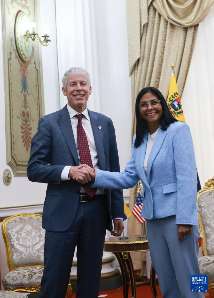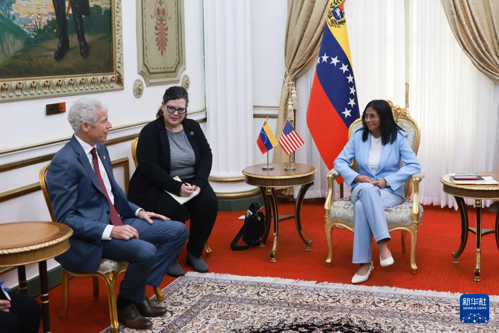 委內(nèi)瑞拉代總統(tǒng)德?tīng)栁鳌ち_德里格斯11日在加拉加斯總統(tǒng)府會(huì)見(jiàn)美國(guó)能源部長(zhǎng)克里斯·賴(lài)特。