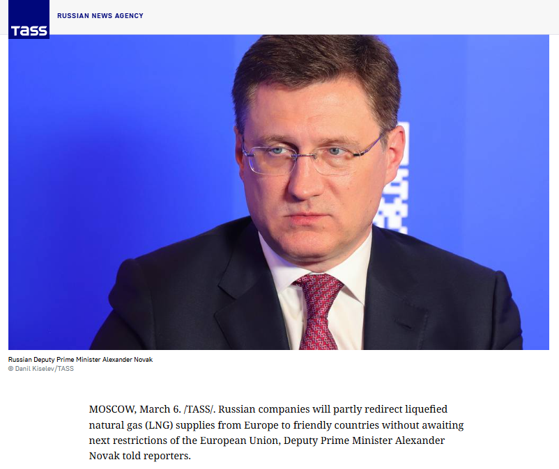 當(dāng)?shù)貢r(shí)間3月6日,俄羅斯副總理諾瓦克表示,俄羅斯企業(yè)近期將把部分供應(yīng)歐洲的液化天然氣轉(zhuǎn)向其他有需求的國(guó)家。