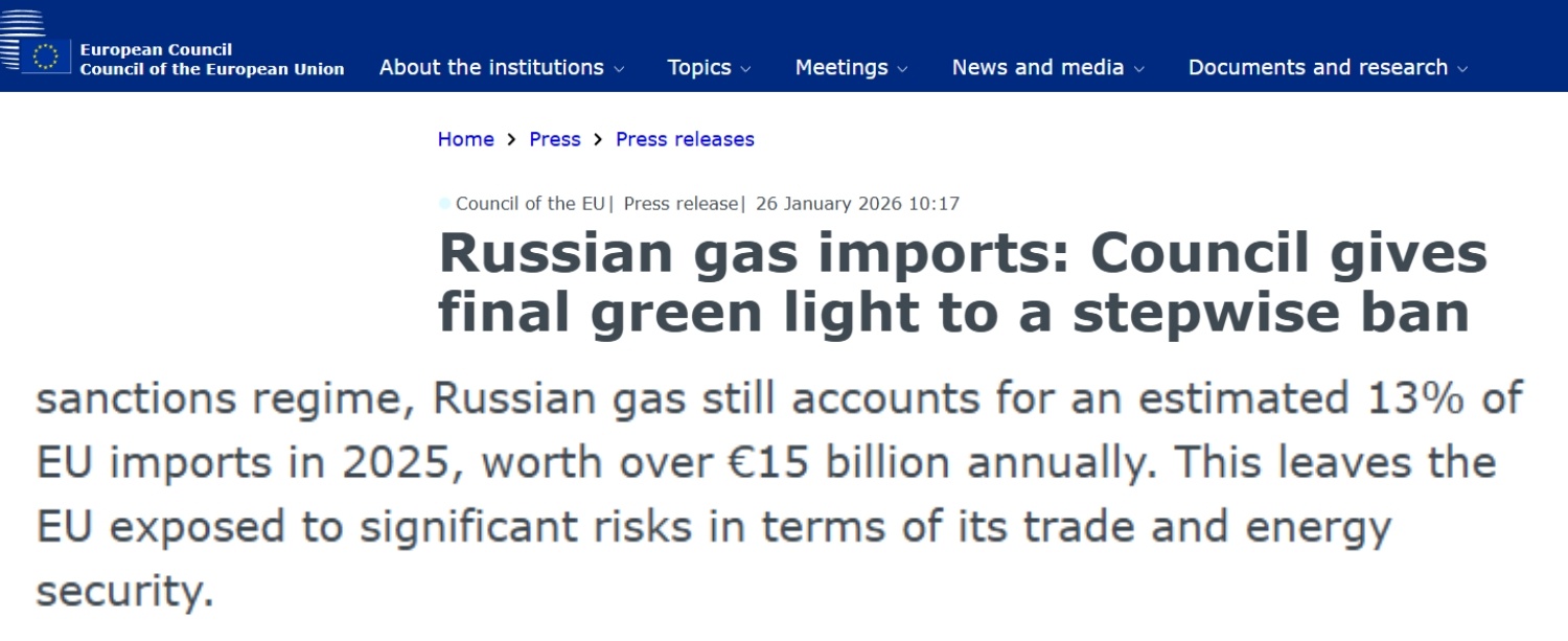 歐盟27個(gè)成員國(guó)1月26日正式通過關(guān)于逐步禁止從俄進(jìn)口管道天然氣和液化天然氣的法規(guī)。對(duì)從俄進(jìn)口液化天然氣的全面禁令將于2027年年初生效,對(duì)進(jìn)口管道天然氣的全面禁令將于2027年秋季生效。2025年,俄天然氣約占?xì)W盟進(jìn)口總量的13%,價(jià)值超過150億歐元。