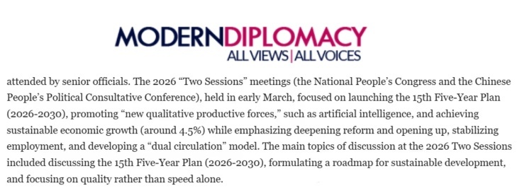 歐洲《現(xiàn)代外交》網(wǎng)站近日刊登埃及本尼蘇伊夫大學(xué)副教授納迪亞·赫爾米博士的評(píng)論文章稱,今年中國(guó)兩會(huì)重點(diǎn)關(guān)注發(fā)展模式創(chuàng)新與深化伙伴關(guān)系。會(huì)議議題包括通過共建“一帶一路”倡議推動(dòng)“高質(zhì)量發(fā)展”,深化數(shù)字經(jīng)濟(jì)、基礎(chǔ)設(shè)施及能源領(lǐng)域的國(guó)際合作,為推動(dòng)構(gòu)建人類命運(yùn)共同體提供重要平臺(tái)。