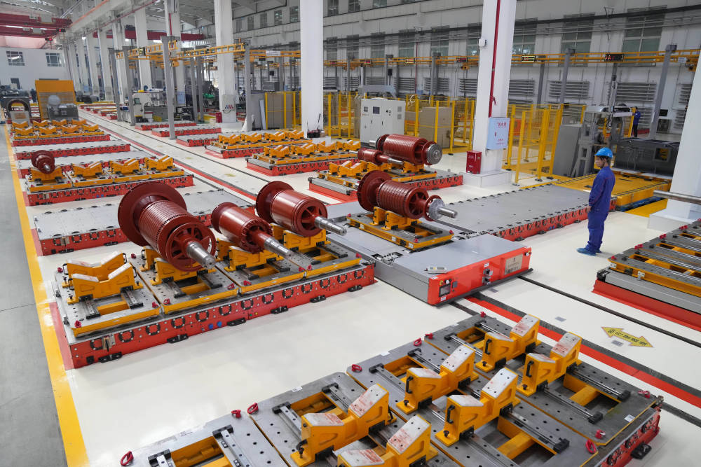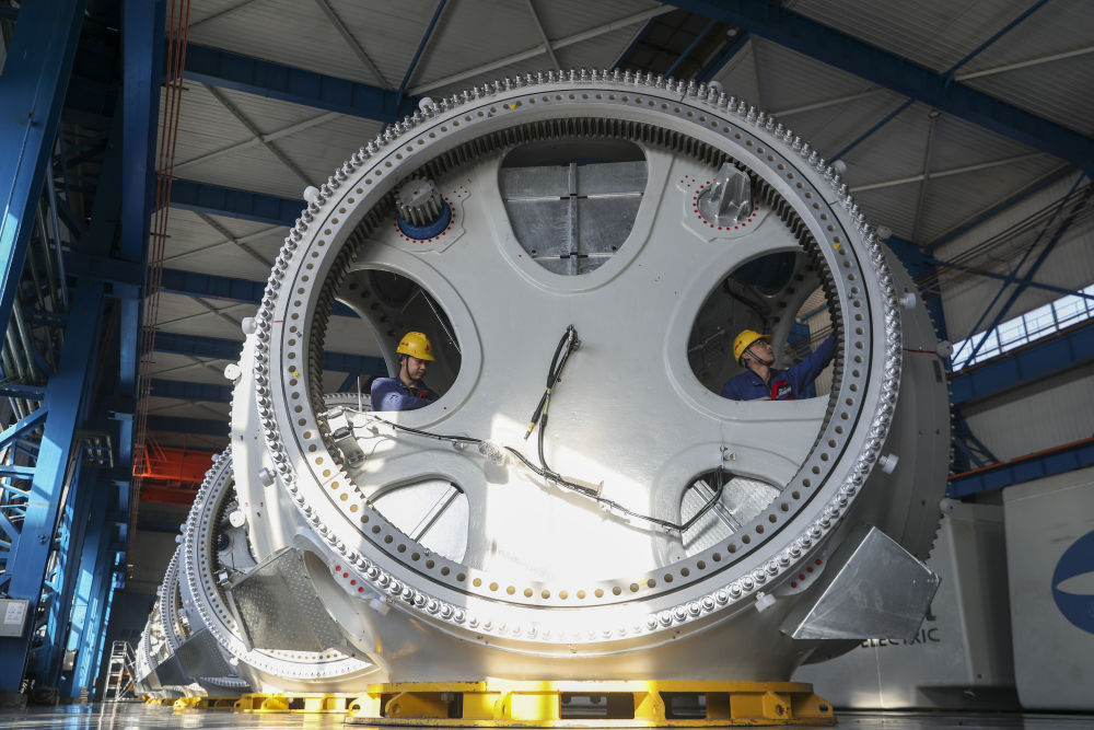 2024年3月5日,在位于黑龍江省齊齊哈爾市的中國(guó)一重集團(tuán)有限公司風(fēng)電裝備生產(chǎn)制造廠生產(chǎn)車(chē)間,工作人員在組裝設(shè)備。新華社記者 張濤 攝