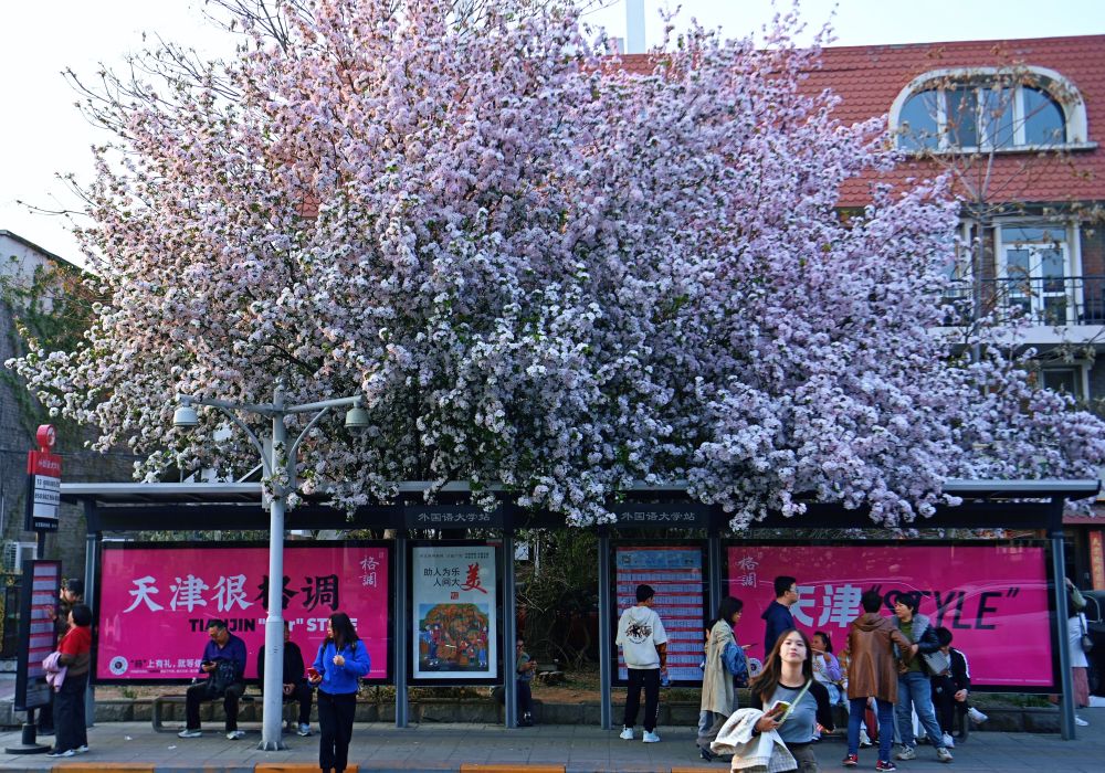 位于天津五大道馬場道的天津外國語大學(xué)公交站旁的海棠花盛開(4月6日攝)。