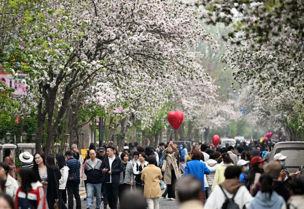 市民在海棠花盛開的五大道大理道上拍照打卡(4月7日攝)。