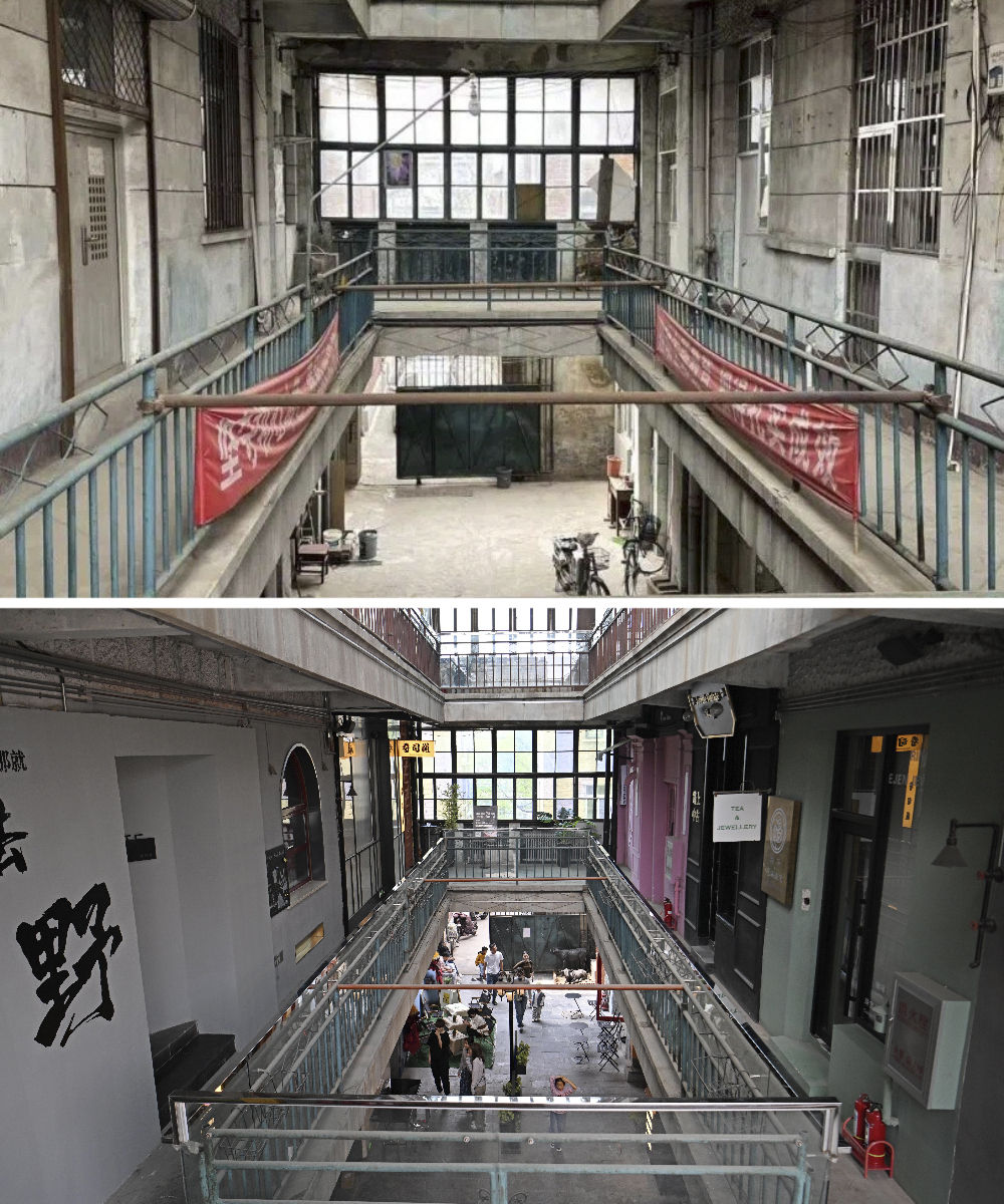 拼版照片:上圖是五大道重慶道225號廢棄廠房內(nèi)景(資料照片);下圖是修繕后的五大道重慶道225號創(chuàng)意街區(qū)(4月13日攝)。