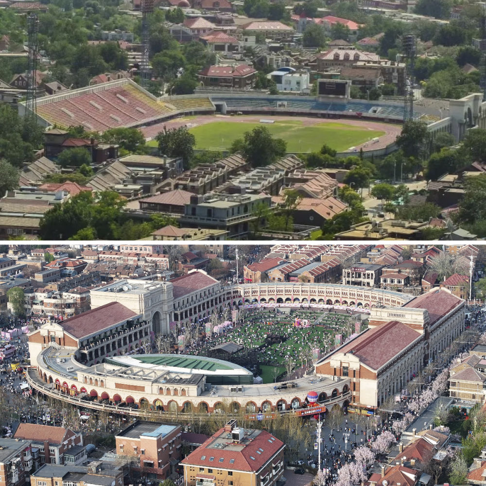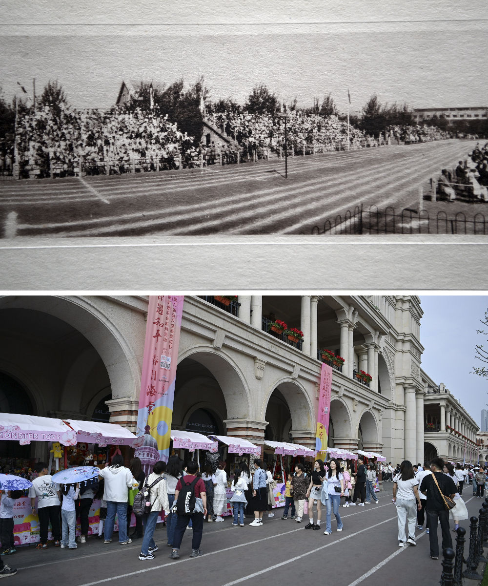 拼版照片:上圖是位于五大道的民園體育場(資料照片);下圖是位于五大道的民園廣場(4月6日攝)。民園廣場的前身是始建于1920年的民園體育場,這里也是中國的第一個(gè)燈光足球場。經(jīng)過提升改造,現(xiàn)在的民園廣場已經(jīng)成為中西合璧的“城市會客廳”。