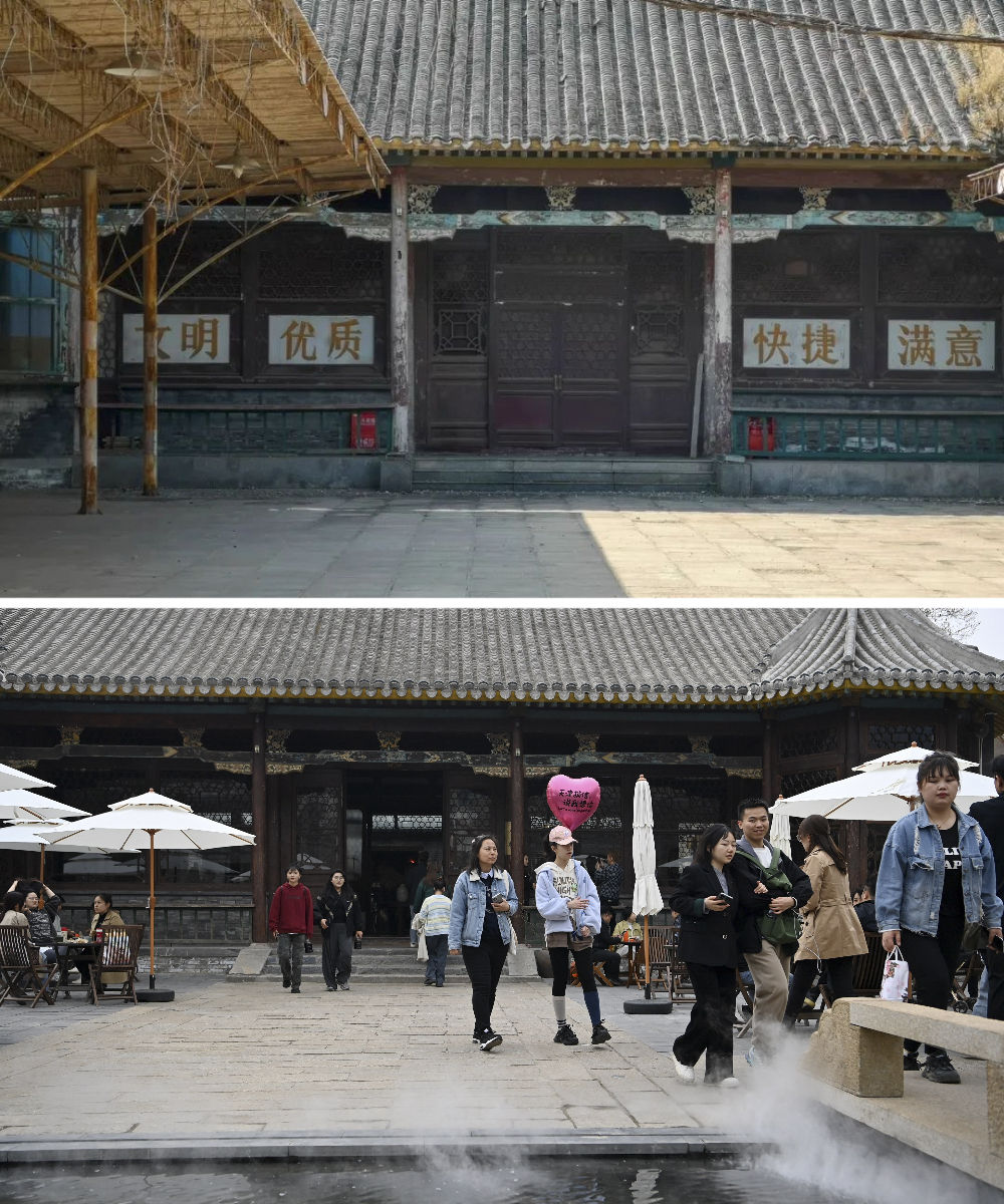 拼版照片:上圖是改造前的先農(nóng)大院(資料照片)。下圖是游客在位于五大道的先農(nóng)大院內(nèi)游覽(4月6日攝)。始建于1925年的先農(nóng)大院是五大道建成最早的建筑群之一,融合了英式聯(lián)排住宅、英式獨(dú)棟別墅等多種特色的建筑風(fēng)格。歲月變遷,這些建筑一度損壞嚴(yán)重,配套設(shè)施老化。2006年起,天津啟動先農(nóng)大院整理項(xiàng)目,對街區(qū)居民進(jìn)行了騰遷,對建筑進(jìn)行了加固修繕,恢復(fù)了街區(qū)的歷史原貌,引進(jìn)了餐飲、文化展示、辦公等業(yè)態(tài),使這里形成了環(huán)境優(yōu)雅的公共藝術(shù)和展示建筑遺產(chǎn)的城市新空間。