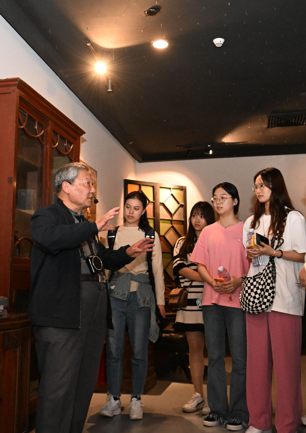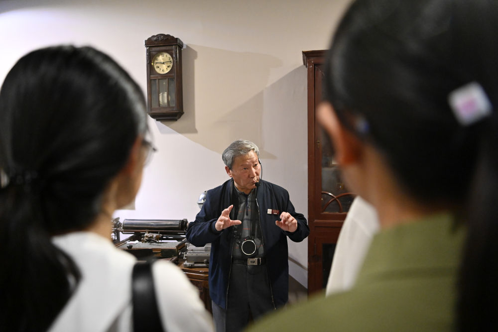 金彭育(左一)在五大道歷史博物館義務(wù)給游客講解(4月13日攝)。