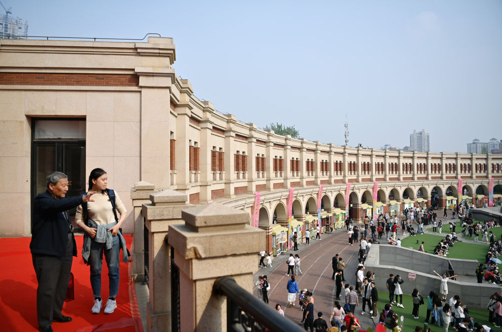 游客在五大道民園廣場休閑游玩(4月13日攝)。