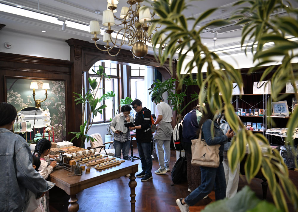 游客在五大道中的一家藝術(shù)品商店內(nèi)選購(4月13日攝)。