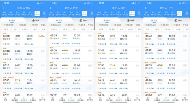 從節(jié)前預(yù)訂情況看,4月30日北京出發(fā),前往武漢、西安、杭州、長沙等方向車票極為緊俏。截至16日16時(shí),上述方向車票大面積售罄,僅清晨6時(shí)許出發(fā)車次尚存余票。
