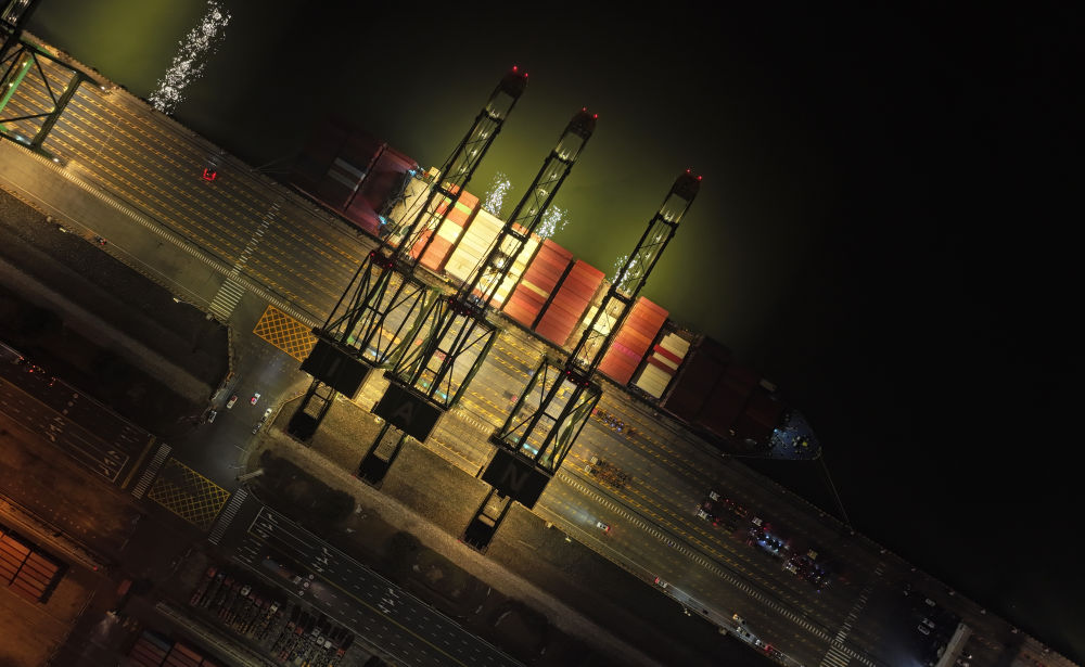 2024年1月16日,大型集裝箱班輪“巴赫”號靠泊在天津港太平洋國際集裝箱碼頭(無人機(jī)照片)。新華社記者 趙子碩 攝
