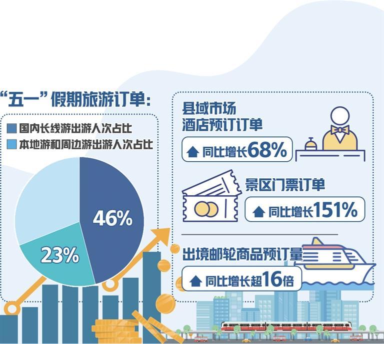 從出游目的地看,北京、上海、重慶、杭州、成都、南京、西安、武漢、廣州等城市是熱門,帶動相關(guān)交通和酒店訂單量走高。去哪兒旅行網(wǎng)顯示,北京—上海、成都—西安、上海—武漢、深圳—長沙、北京—青島等熱門線路的火車票預約購票難度不低于春運;從上海、北京、深圳、廣州、杭州、南京等地出發(fā),飛往旅游城市的機票平均支付價格走高,北京—成都、上海—昆明等熱門航線的部分航班已升至全價;在攜程旅行網(wǎng)上,天水、徐州、淄博、合肥、南昌、迪慶、煙臺等城市的“五一”假期酒店預訂增速明顯;四線及以下城市,尤其是縣域旅游市場帶來新增量,縣域市場酒店預訂訂單同比增長68%、景區(qū)門票訂單同比增長151%。
