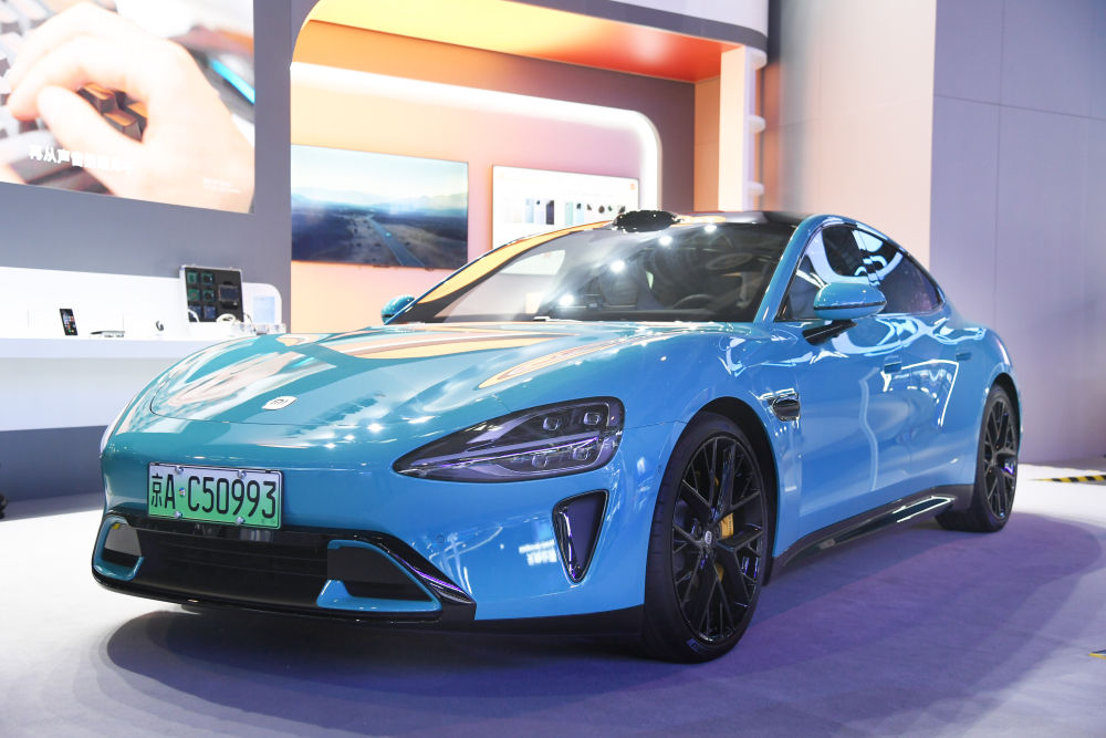 這是2024年4月27日在中關(guān)村展示中心常設(shè)展中拍攝的小米SU7汽車。