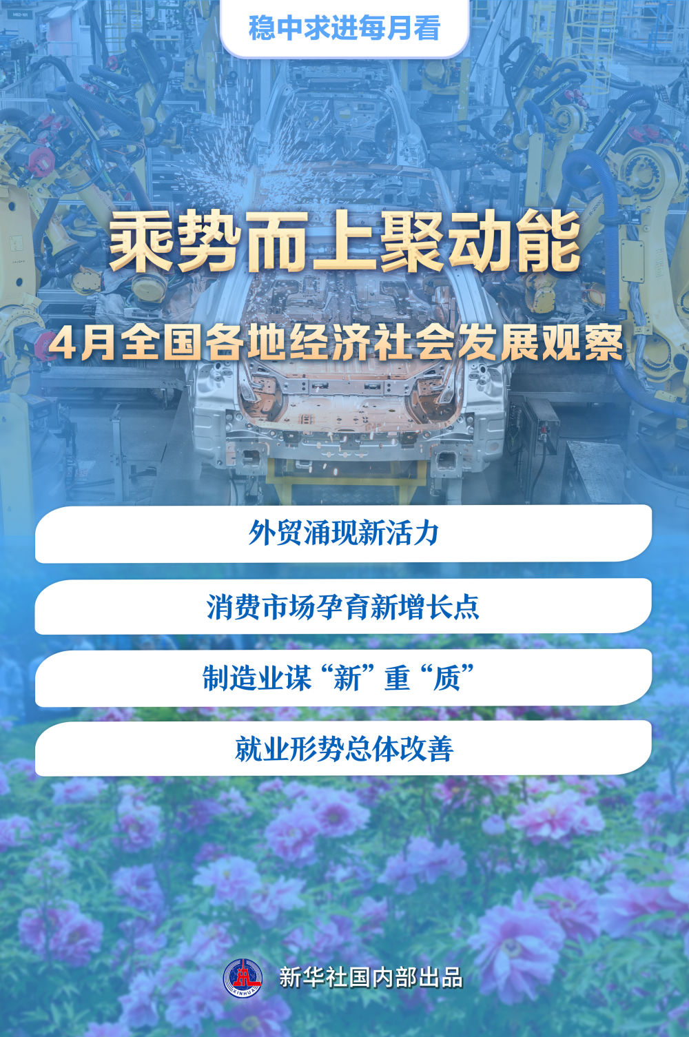 春意盎然育生機(jī)。一季度經(jīng)濟(jì)數(shù)據(jù)出爐釋放積極信號,消費(fèi)市場亮點(diǎn)紛呈,經(jīng)濟(jì)社會發(fā)展對就業(yè)的帶動效應(yīng)逐步顯現(xiàn)……今年4月,全國各地真抓實(shí)干,乘勢而上,進(jìn)一步鞏固和增強(qiáng)經(jīng)濟(jì)回升向好態(tài)勢。