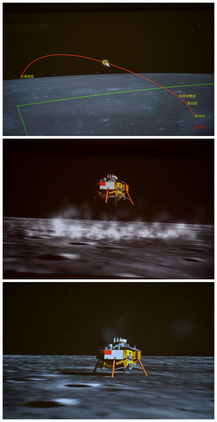 這是2019年1月3日在北京航天飛行控制中心拍攝的降落過(guò)程(示意圖)。2019年1月3日10時(shí)26分,嫦娥四號(hào)探測(cè)器自主著陸在月球背面南極-艾特肯盆地內(nèi)的馮·卡門(mén)撞擊坑內(nèi),實(shí)現(xiàn)人類(lèi)探測(cè)器首次在月球背面軟著陸。新華社記者 金立旺 攝