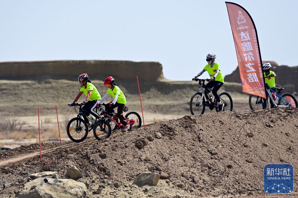 在新疆克拉瑪依市烏爾禾區(qū)世界魔鬼城景區(qū),小朋友們在自駕線路上體驗(yàn)自行車越野(5月1日攝)。