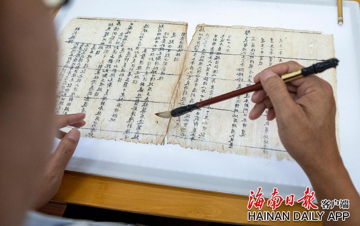 黃文鋒將修復后的古籍書頁,粘貼、加固到新紙上。海南日報記者袁琛 攝