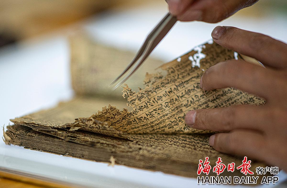 黃文鋒在查看古籍紙張破損情況。海南日報記者袁琛 攝