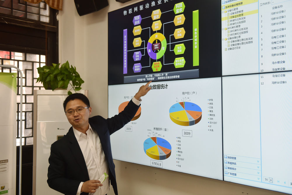 “漁博士”沈杰在浙江省湖州市菱湖鎮(zhèn)創(chuàng)辦的公司內(nèi)介紹匯集養(yǎng)殖戶、飼料廠商、銷售檔口、金融機(jī)構(gòu)等相關(guān)方的物聯(lián)網(wǎng)平臺(tái)(資料照片)。