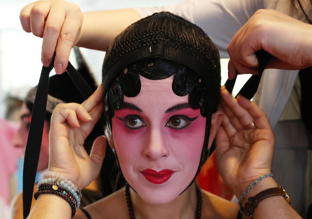 2023年9月9日,在法國(guó)巴黎中國(guó)文化中心,法國(guó)觀眾體驗(yàn)昆曲旦角扮相。新華社記者高靜 攝