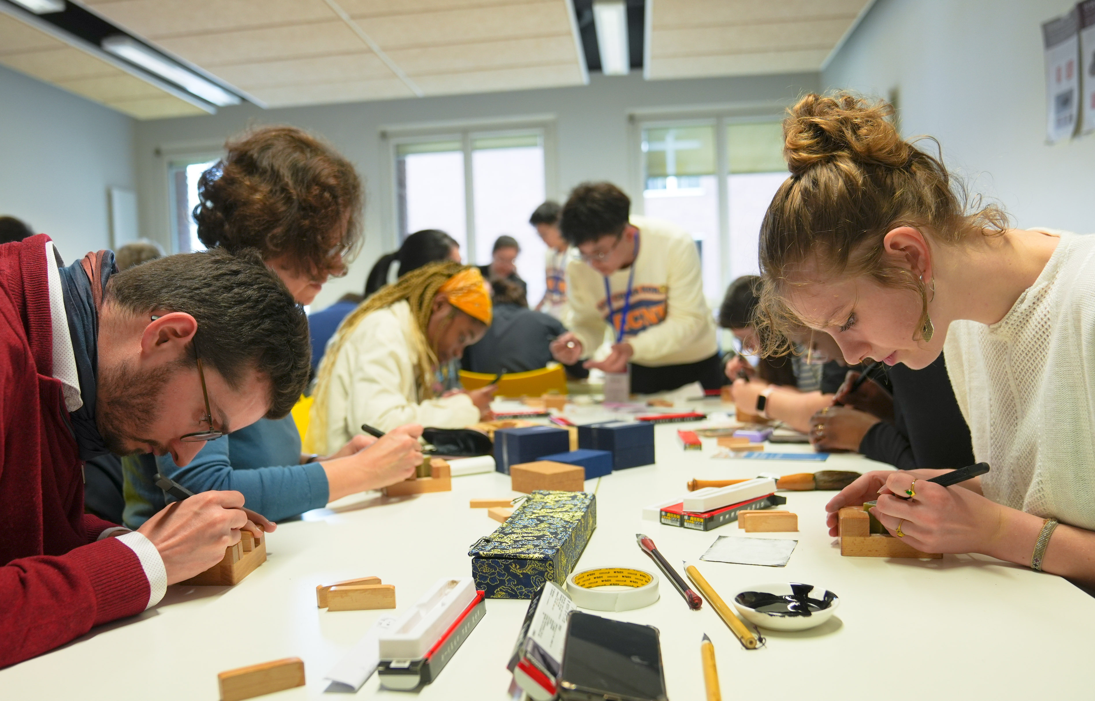 5月2日至5月6日,華東師大“漢字走進(jìn)法國(guó)校園”工作坊活動(dòng)在新里昂中法大學(xué)、熱納斯鎮(zhèn)路易·萊普林斯—林蓋中學(xué)、里昂二大與里昂國(guó)際學(xué)校相繼舉行。當(dāng)?shù)卮笾行W(xué)生和市民參觀了由華東師大美術(shù)學(xué)院書法篆刻專業(yè)4位老師和43位在校研究生創(chuàng)作的書法篆刻作品,首次動(dòng)手體驗(yàn)了篆刻的樂趣。