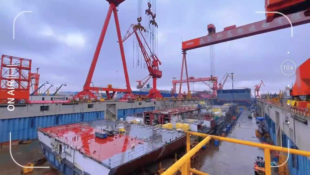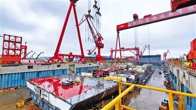 兩臺(tái)龍門吊緩緩起降,有序吊裝船體部件——中國(guó)船舶集團(tuán)上海外高橋造船2號(hào)船塢,第二艘國(guó)產(chǎn)大型郵輪不久前在這里迎來(lái)下塢搭載總裝節(jié)點(diǎn)。