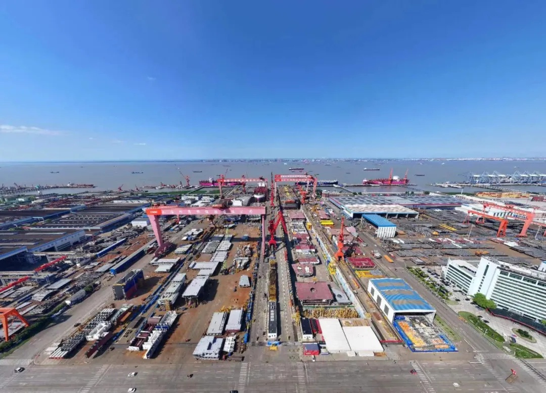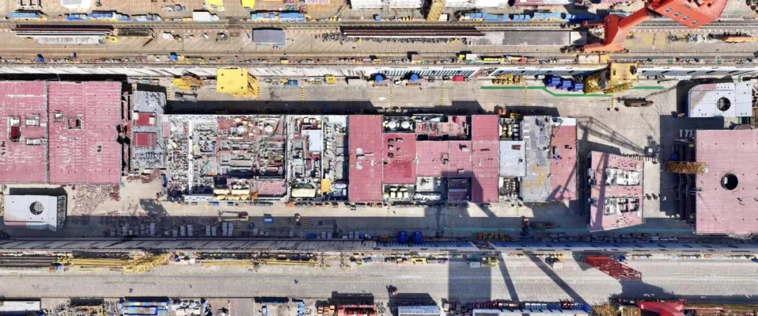 俯瞰第二艘國(guó)產(chǎn)大型郵輪搭載總裝現(xiàn)場(chǎng)。陸佳駿 攝