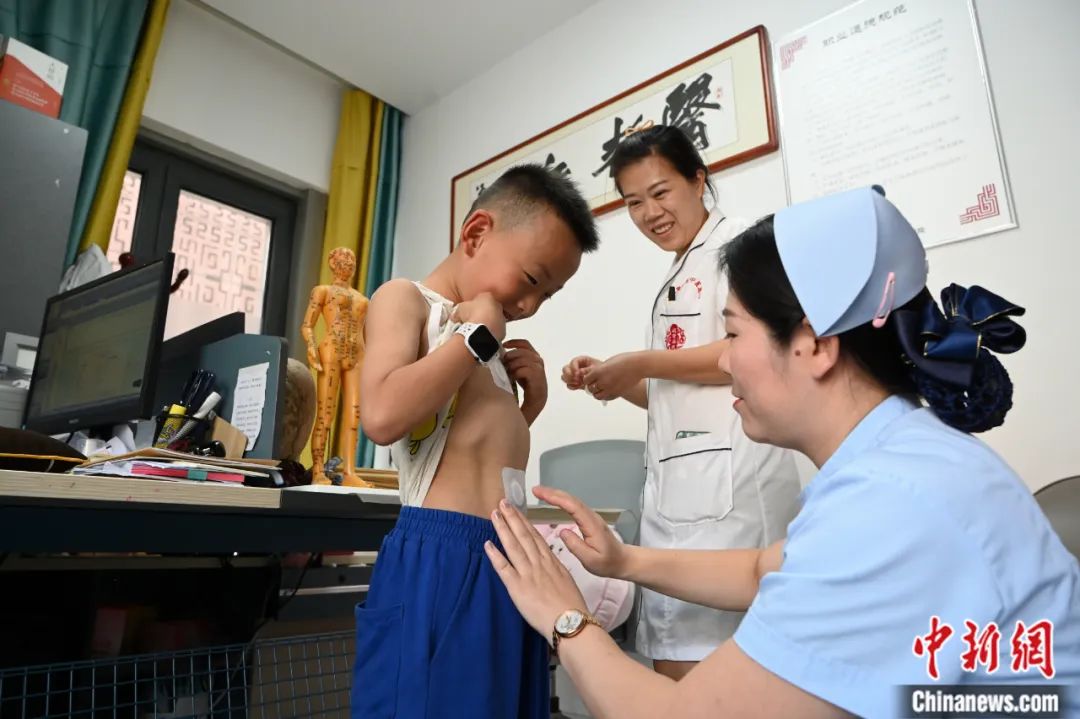 2023年7月11日,入伏首日,在內(nèi)蒙古呼和浩特市一醫(yī)院內(nèi),醫(yī)護人員為小朋友貼“三伏貼”?!叭N”是一種傳統(tǒng)的冬病夏治療法。劉文華 攝