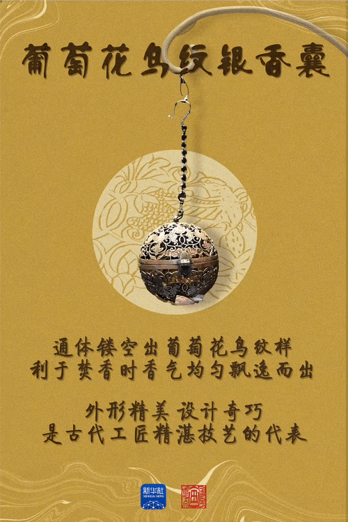 葡萄花鳥紋銀香囊體現(xiàn)了唐代貴族的生活意趣?!疤拼鐣拈_放包容,人們生活中的儀式感都融入在這枚香囊之中?!标兾鳉v史博物館副研究館員賀達(dá)炘說。