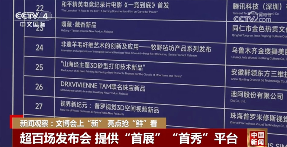 首次設(shè)立國際文化貿(mào)易展,邀請西班牙貿(mào)易協(xié)會(huì)、尼泊爾工商聯(lián)合會(huì)等國外貿(mào)易機(jī)構(gòu)參展,一站式包攬各地文化產(chǎn)業(yè)精品;在影視·出版·版權(quán)·游戲電競展,首次亮相的“城市文化合伙人”主題展呈現(xiàn)“文化+交易產(chǎn)業(yè)融合新產(chǎn)品”,傳播城市優(yōu)秀文化。據(jù)悉,今年的文博會(huì)將舉辦超100場創(chuàng)新項(xiàng)目及新品發(fā)布會(huì)和超20場招商會(huì)、推介會(huì)等,為國內(nèi)外新產(chǎn)品、新技術(shù)、新業(yè)態(tài)、新服務(wù)的發(fā)布提供“首展”“首發(fā)”“首秀”平臺(tái)。