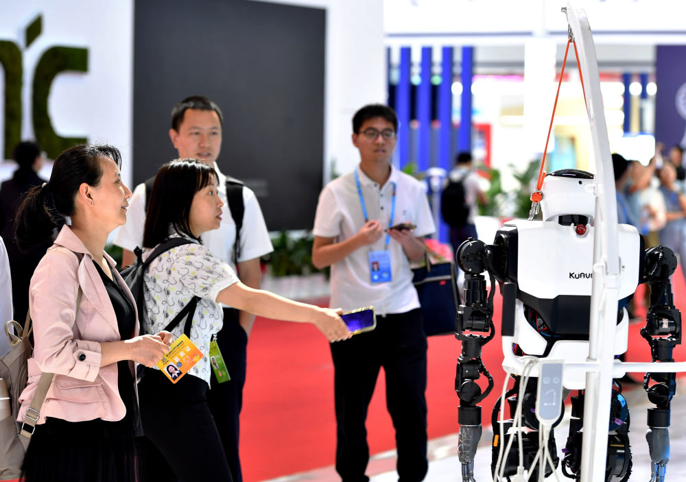 5月24日,在第七屆數(shù)字中國(guó)建設(shè)峰會(huì)現(xiàn)場(chǎng)體驗(yàn)區(qū),觀眾在觀看“移動(dòng)愛(ài)家機(jī)器人”。新華社記者魏培全攝