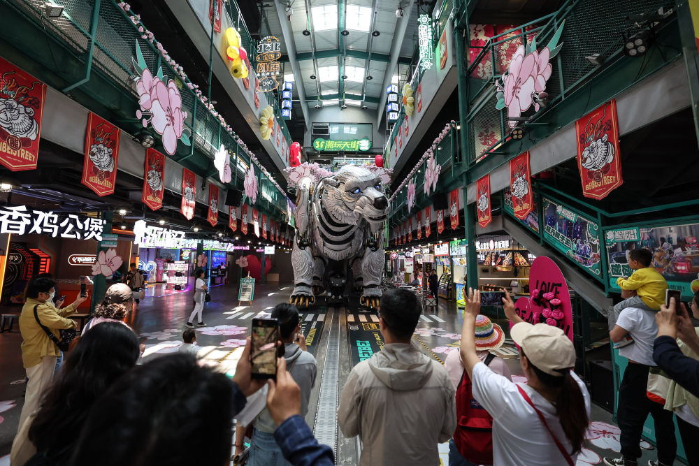 大連熊洞街,當(dāng)身高6米、重達(dá)25噸,灰色的仿生機(jī)械巨熊時而張口咆哮,時而緩緩前行,游客爆發(fā)出陣陣歡呼。大連冰山慧谷發(fā)展有限公司總經(jīng)理助理藍(lán)費(fèi)靜說:“這一街區(qū)由擁有近百年歷史的大連冰山集團(tuán)舊址改造而來,現(xiàn)已匯聚上百家游樂、電玩、研學(xué)商戶,老廠房煥發(fā)了新生機(jī)。”