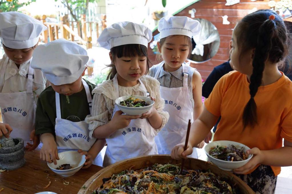 洗菜、烙餅、烤麥子、包餃子、磨豆?jié){……初夏時(shí)節(jié),江蘇省徐州市徐海路幼兒園煙火氣升騰,教室外的小院好不熱鬧。