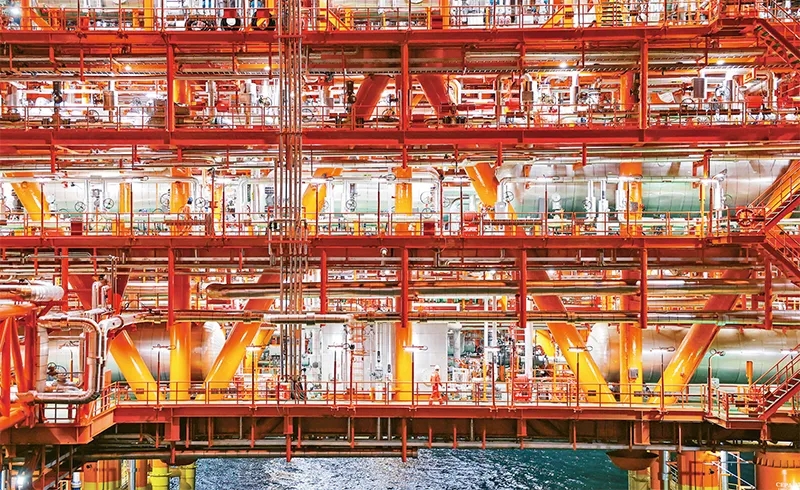 近年來,我國堅(jiān)持創(chuàng)新引領(lǐng),加快發(fā)展新質(zhì)生產(chǎn)力,重大工程科技含量持續(xù)攀升。2023年11月14日,中國海油宣布我國渤海首個(gè)千億方大氣田——渤中19—6氣田Ⅰ期開發(fā)項(xiàng)目成功投產(chǎn),標(biāo)志著我國海上深層復(fù)雜潛山油氣藏開發(fā)邁入新階段。圖為工作人員在渤中19—6氣田作業(yè)。 新華社發(fā) 杜鵬輝/攝