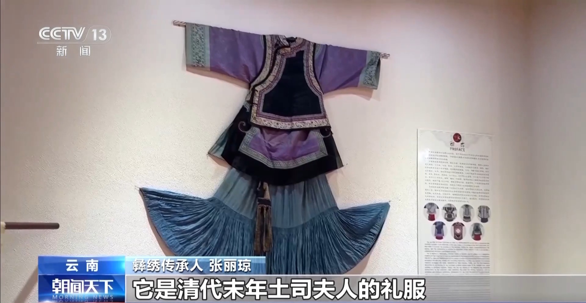 彝繡傳承人 張麗瓊:這一套彝族服飾,有100多年了,它是清代末年土司夫人的禮服。它整套服飾都是絲綢制作出來的,裙子就是彝族最有代表性的百褶裙,非常輕盈。