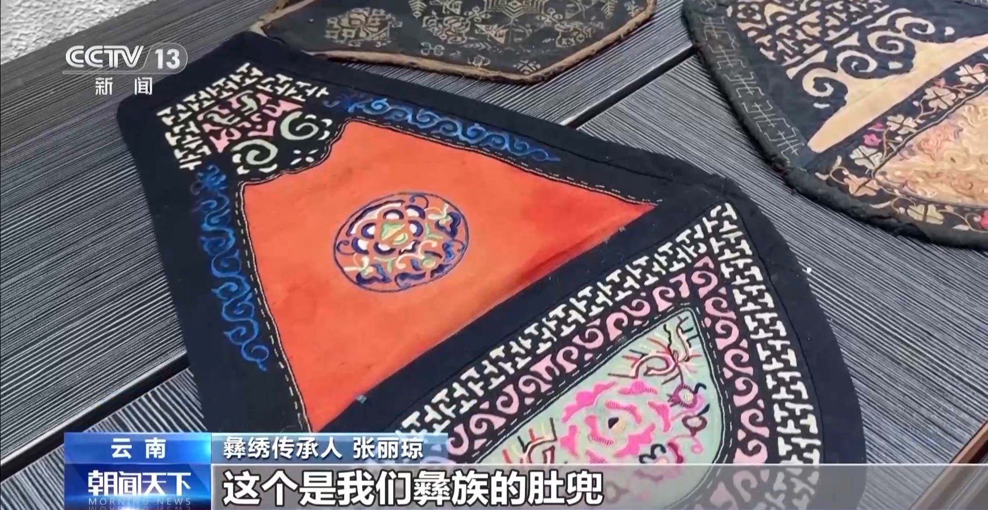 彝繡傳承人 張麗瓊:這個(gè)是我們彝族的肚兜,是彝族小姑娘送給彝族小伙子的定情物。它上面有很多現(xiàn)在已經(jīng)失傳的刺繡針法,像貼布繡、長(zhǎng)針繡、平針繡。