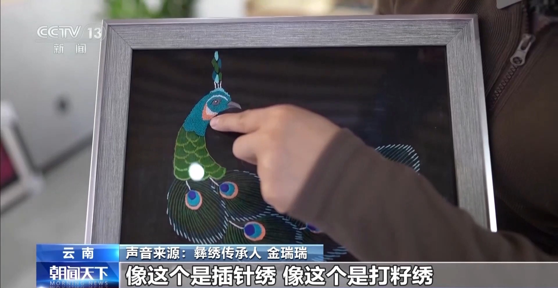 彝繡傳承人 金瑞瑞:像這個(gè)是插針繡,像這個(gè)是打籽繡。它的針法都是有很多種。