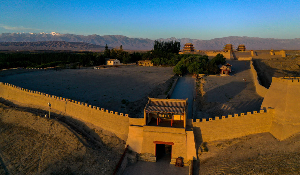 位于甘肅省嘉峪關(guān)市的嘉峪關(guān)關(guān)城(2023年7月14日攝,無(wú)人機(jī)照片)。新華社記者 方欣 攝