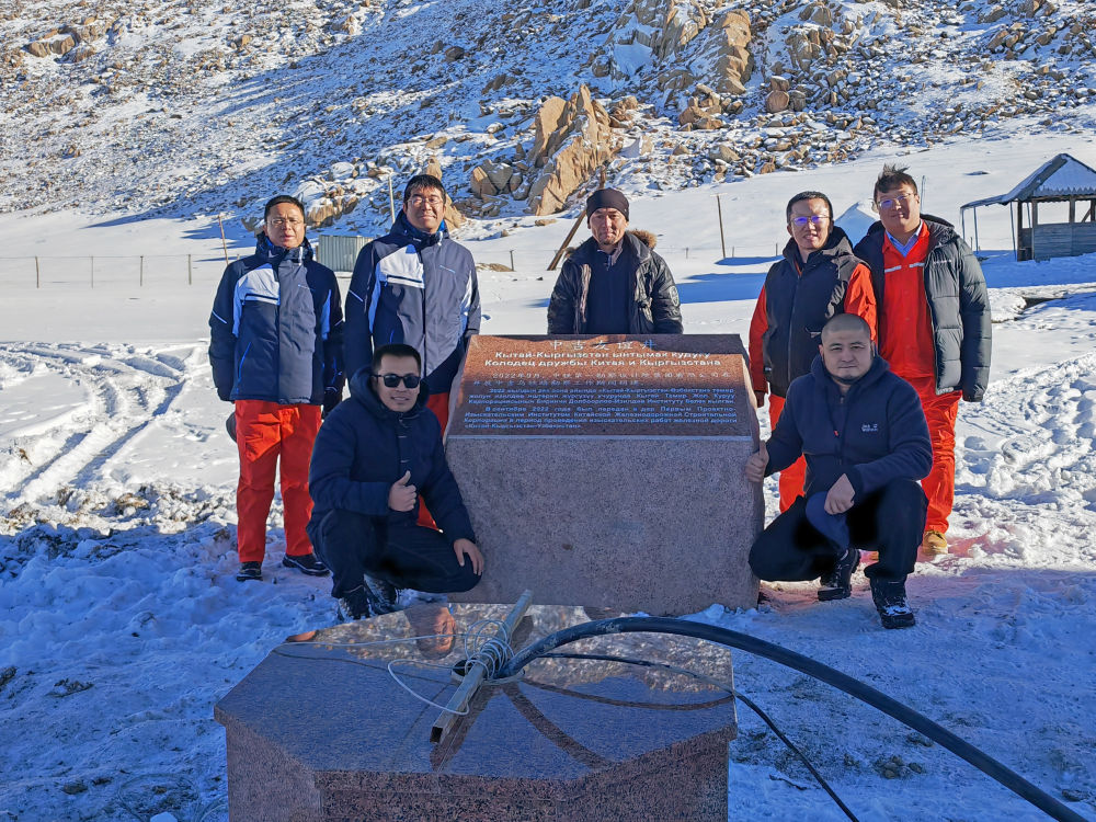 執(zhí)行中吉烏鐵路可行性研究的中鐵第一勘察設(shè)計院專家團隊成員在吉爾吉斯斯坦納倫州的“中吉友誼井”(前)和紀念石碑旁合影(2022年11月26日攝)。新華社發(fā)(中鐵第一勘察設(shè)計院供圖)