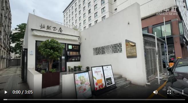 雅致的白色二層小樓,一層是書屋,二層是露臺。一面鏤空幕墻半圍起一個(gè)小巧庭院,“春茶到了”的招牌與蔥蘢繁花相映成趣。